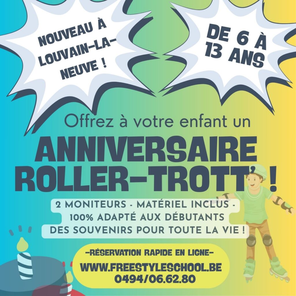 Nous proposons 2h30 de prise en charge, et nous commençons toujours pas les 2h de roller, pour finir par les 30 min de fête/gâteau/cadeaux. Nous nous occupons de toute la partie logistique (set-up eco-friendly) pour une salle de fête prête à l’emploi, accueillante et joliment décorée., Nous laissons par contre le soin et le plaisir aux parents d’amener le gâteau/pic-nic/apéro de votre choix, ainsi que les boissons.